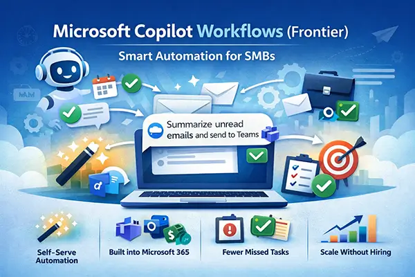 Workflows (Frontier) isn’t about building giant enterprise automations. It’s about turning the everyday operational drag—triage, reminders, follow‑ups, approval chasing—into background execution using the Microsoft 365 tools SMBs already live in.