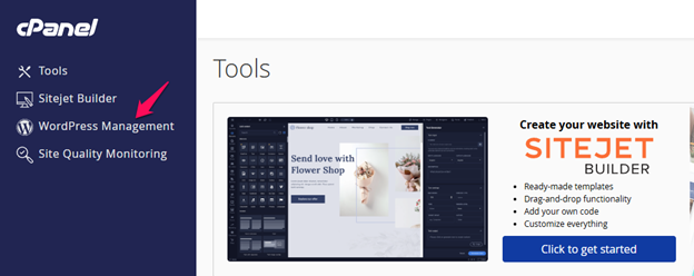 Step2: Select the WordPress Management tool in the side navigation pane or search and navigate to the WordPress Management under Domains option.