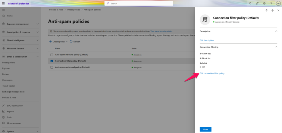 Step 9: Click Edit Connection Filter Policy.
