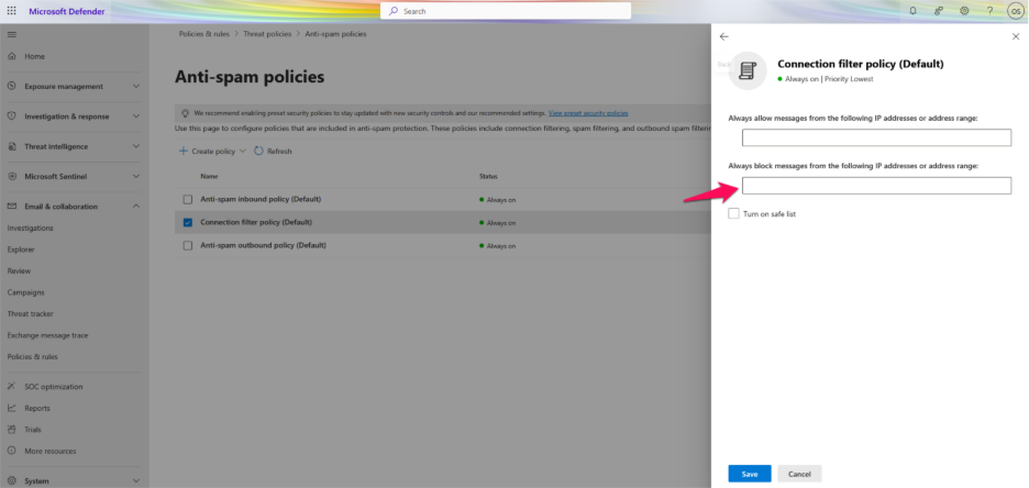 Step 10: Under, Always block messages from the following IP addresses or address range, enter the IP address or range to be blacklist.