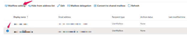 Step5: In the list of users, select the user mailbox and click on the Mail Flow settings.
