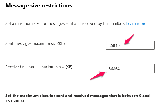 Step7: Now, you will see the send & receive maximum message size in KB in the flyout pane. Also, you can adjust the size as per your wish.
