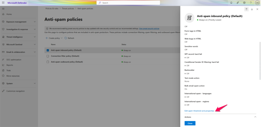 Step9: Scroll and select Edit Spam Threshold and Properties.