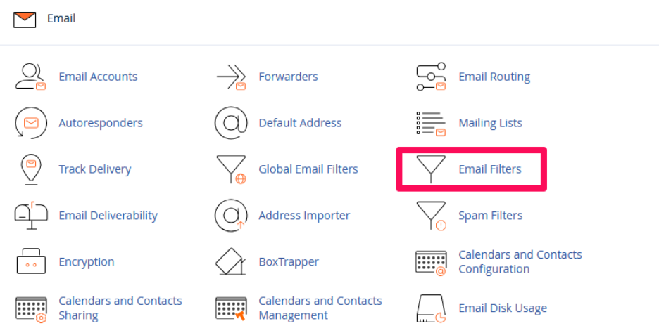 - Under the Email section, locate and click on “Email Filters” (this might be called “Global Email Filters” or “Email Filtering” depending on your cPanel version).