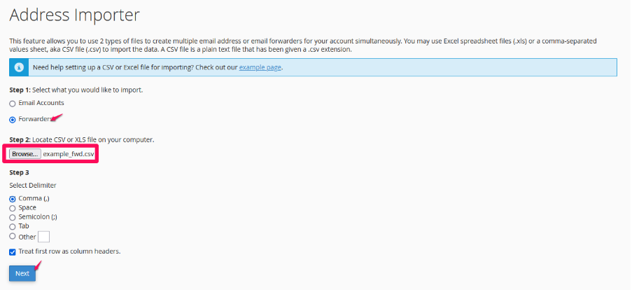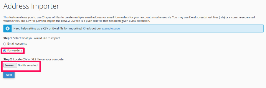 Click on “Choose File” or “Browse” (depending on your cPanel version) to select and upload the CSV file containing the forwarders list.