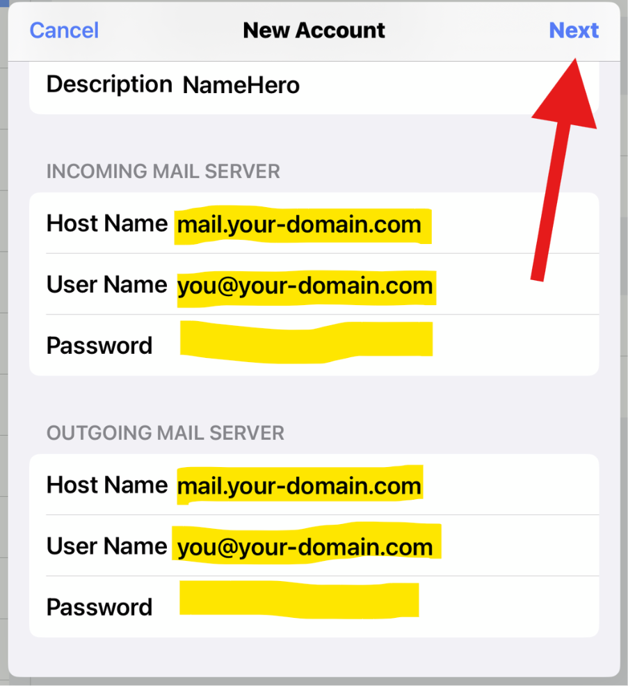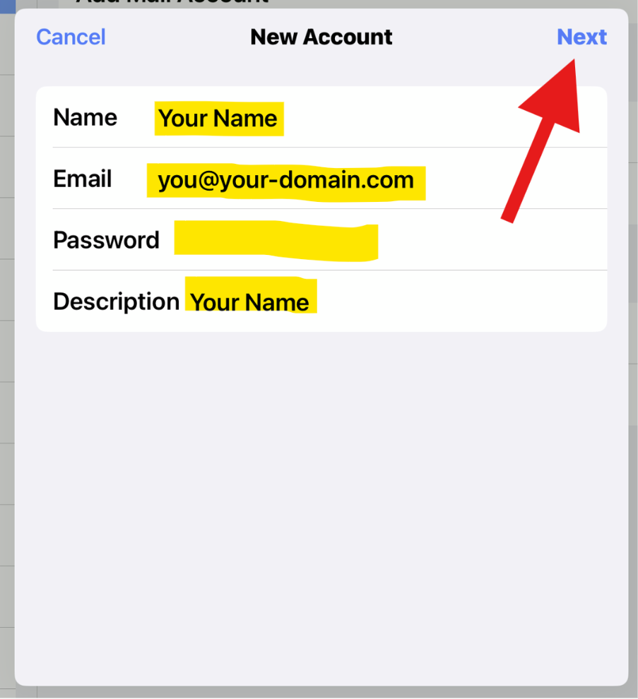 Step 5: Under “Mail Account”, enter your name, email address, password, and a description for the email account. Tap “Next”.