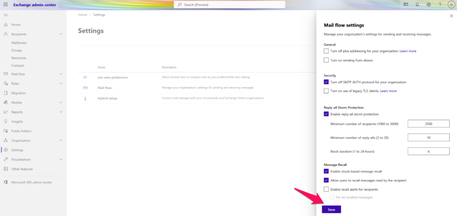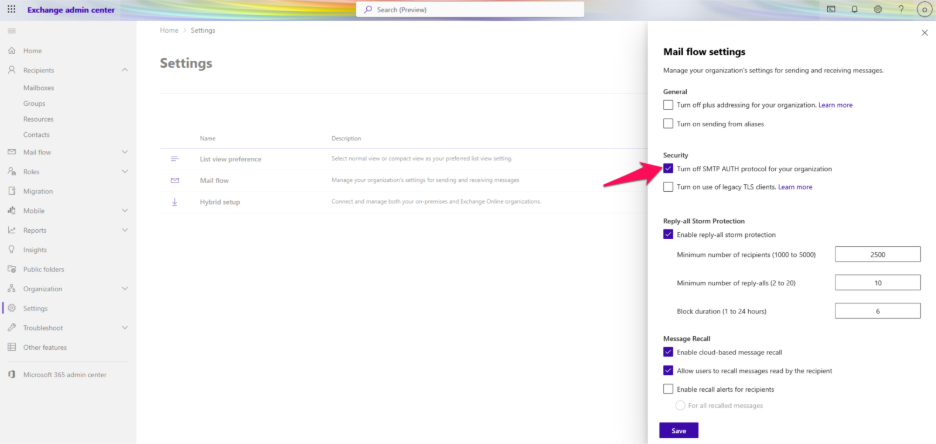 Step 7: Under Security, click Turn off SMTP AUTH protocol for your organization.